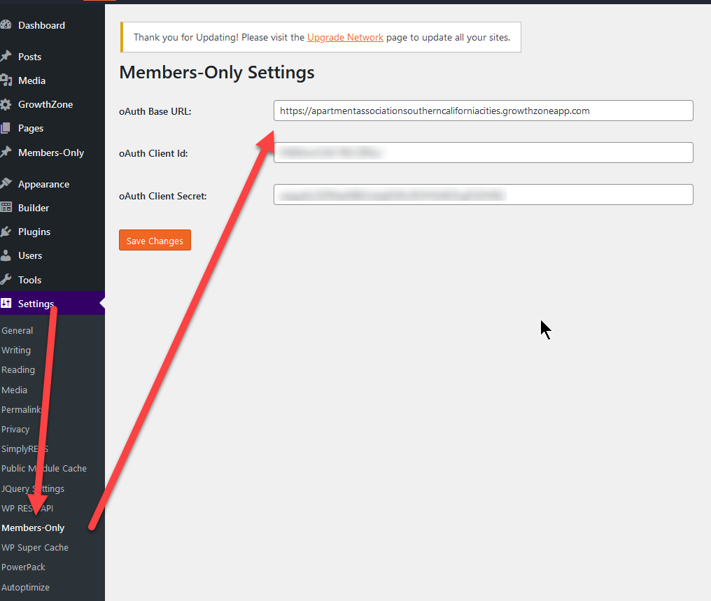 - Enter in the oAuth client secret (this can be found, in the location from Setting up a tenant in GrowthZone for Members-Only)