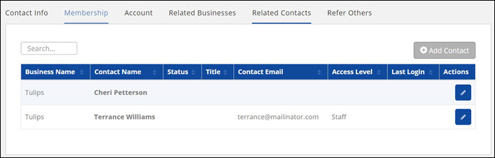 - Click the Add Contact button to add a new contact. NOTE: Create privileges are needed to add new information. If the contact previously belonged to another member organization, adding them to a different/new organization via the Info Hub will NOT change their contact record in the back office; rather, it will create a new contact record, and will trigger the New Person Added to Existing Membership staff notification. Staff can then determine if the two records need to be merged in the back office or not.