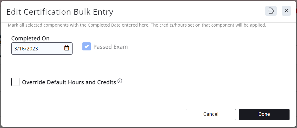 - On the Edit Certification Bulk Entry screen, the system will apply the credits/hours to the selected contact(s) as configured in the certification components. By default the Completed On date will be today's date, but you can modify that if needed.