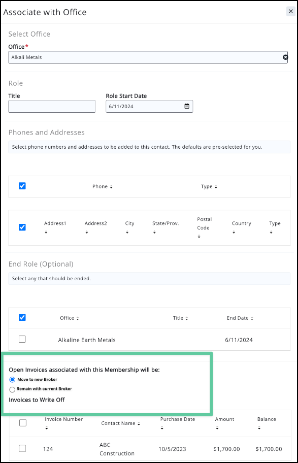 When a member transfers to a new organization, association staff are prompted to move any open invoices or leave them with the current Billing Responsible Party.