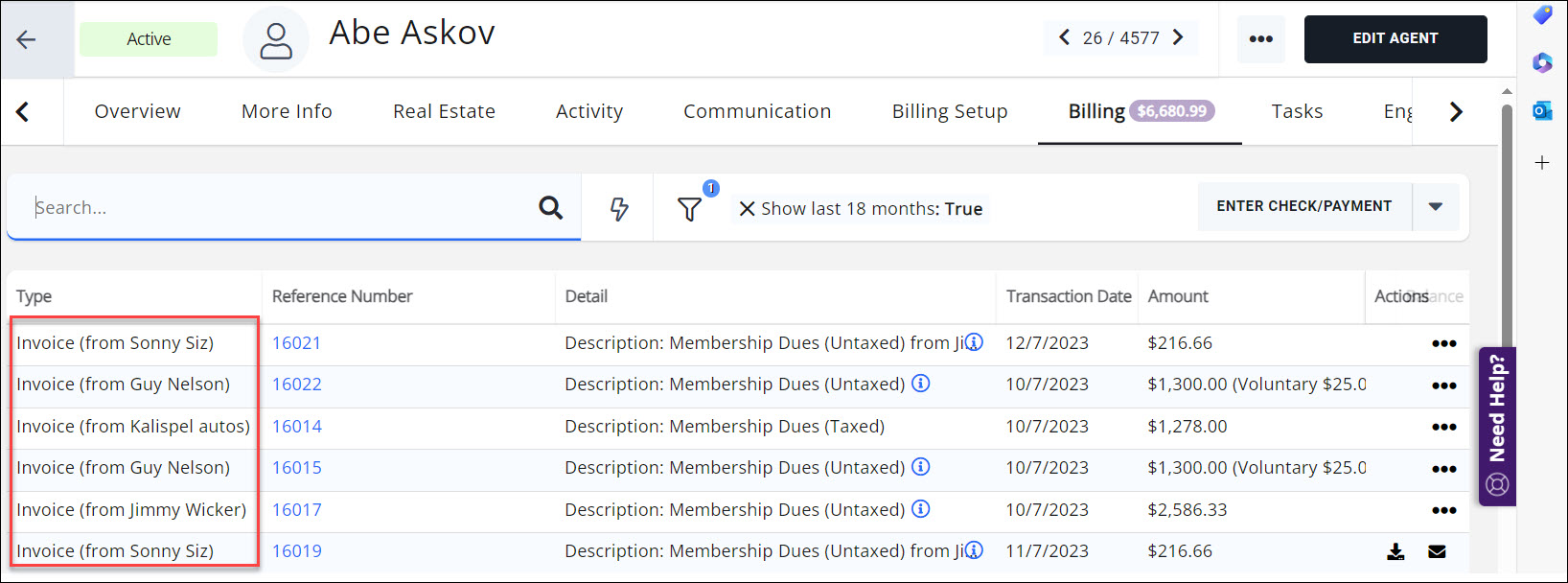 - The invoice will display on the BRP's Billing tab with the name of the agent.