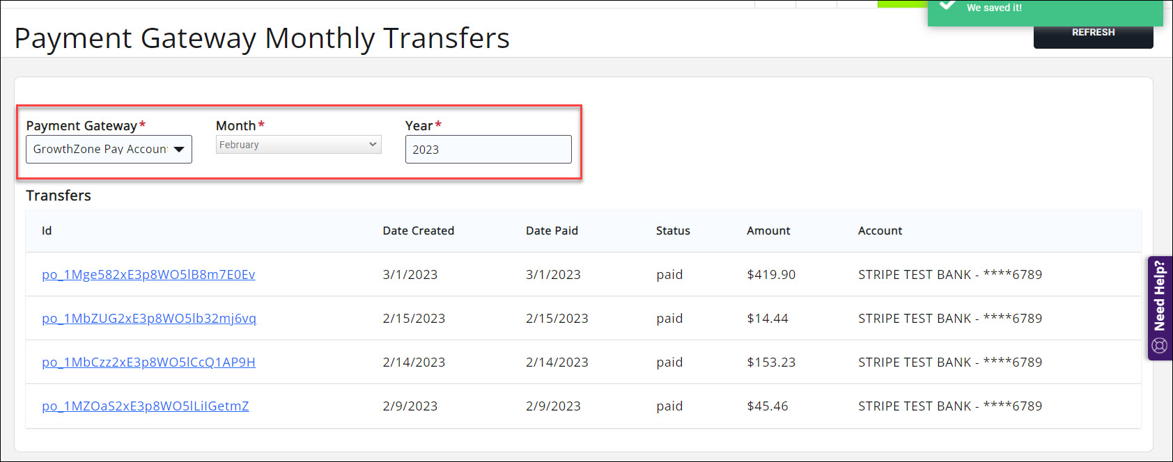 The GrowthZone Pay Monthly Transfers report provides a list of all transfers from a selected gateway, month and year. This report will give you all of the payments that match up with a specific transfers to your bank account and the initial transaction date. This report should be used to find the fees associated with credit card transactions so that you can make the appropriate journal entries into your accounting software.