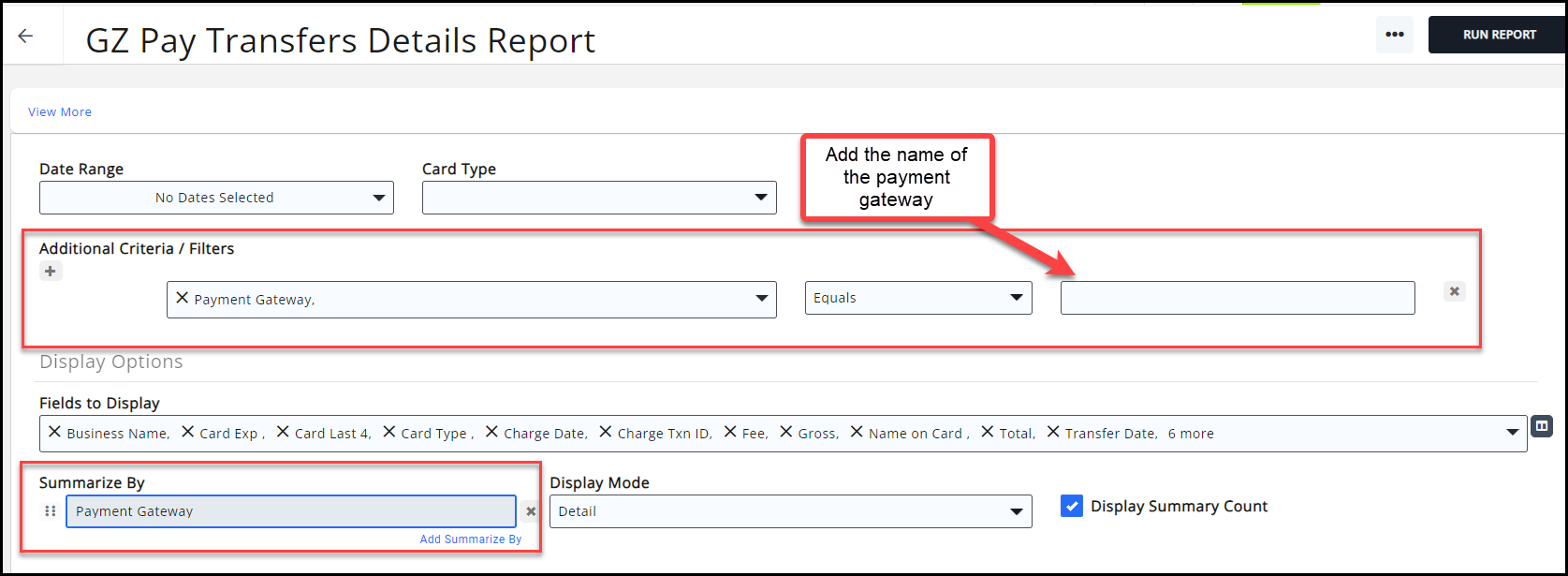 Other Billing reports will allow you to choose the Payment Gateway as a filterable option both under Additional Criteria as well as the Display Options. Add the name of the Payment Gateway you would like to be filtered for your report. You will notice that transaction fees are shared by the multiple payment gateways; they are not doubled.