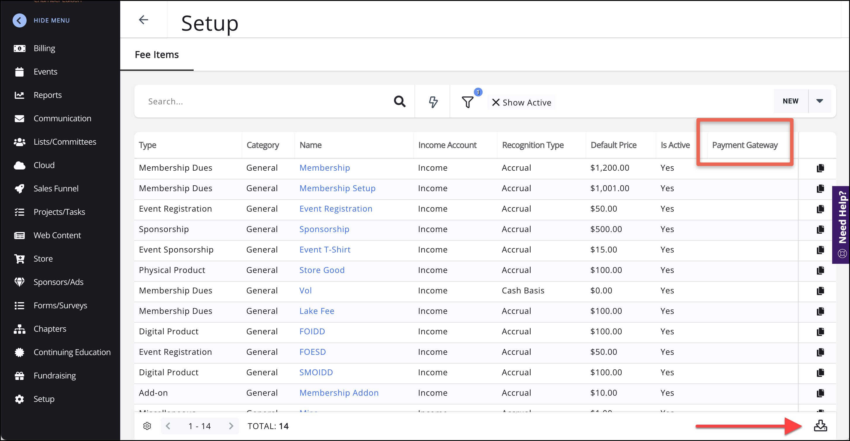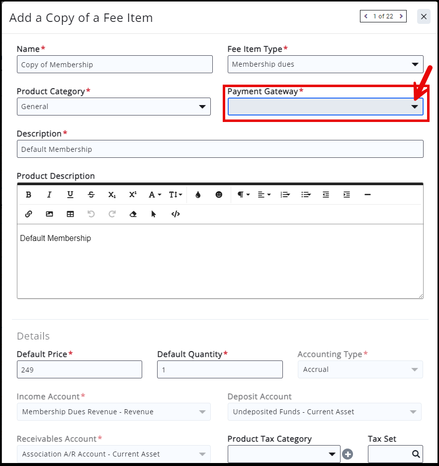 Split Payment Gateways (GrowthZone Pay only) allows associations to choose through which gateway a fee item is processed when there is more than one gateway set up in the database. If you have not set up an initial payment gateway, see Setup GrowthZone Pay for more information. Once you set up more than one GrowthZone Pay gateway, the system will allow you to choose a payment gateway option for each fee item.