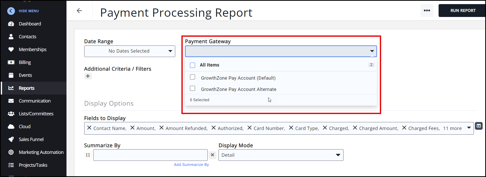 The Payment Processing Report allows you select your payment gateway (If blank, the default gateway is used).