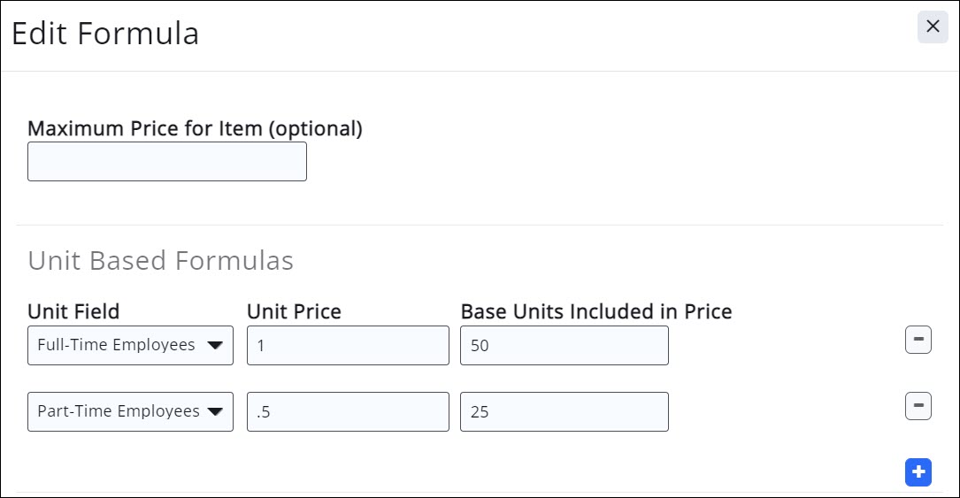 - Enter the Base Units Included in Price. Entering a “base unit included in price” will subtract this number from the amount entered in the field and the calculation will occur on a value greater than 1. For example, if there are 100 full time employees and 55 are included in the base, the calculation will occur on the remaining 45.