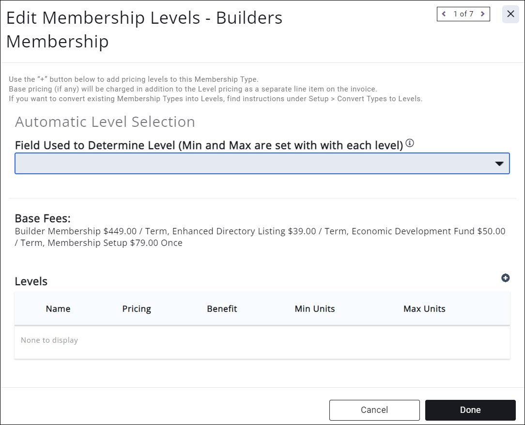 - Select the field to be used for assigning levels from the Field Used to Determine Level (Min and Max are set with with each level) list. Fields displayed are those you have selected for your variable dues formula.