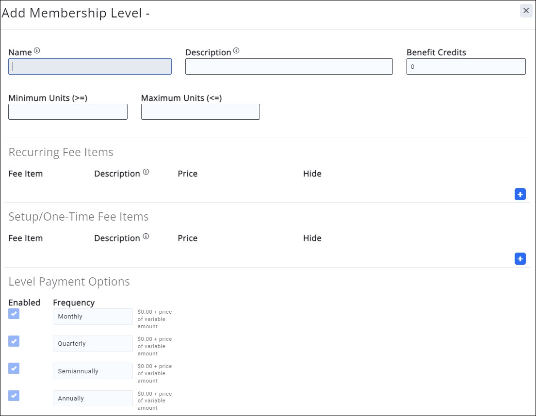 - Add Fees if applicable, however, with variable dues, fees are configured under the Pricing functions. If fees are added, these fees would be in addition to the fees assigned under pricing.