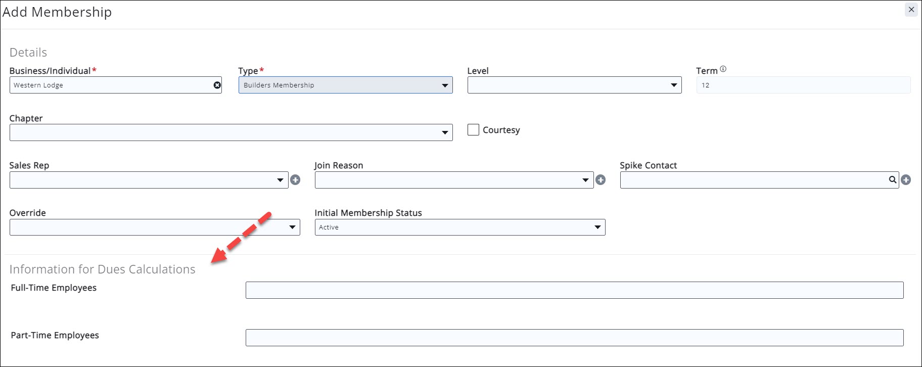 When adding a membership for which pricing is setup on a formula, an Information for Dues Calculation section will be displayed on the Add a Membership screen. Your staff will enter the appropriate values, and the system will calculate the additional fees based on the formula setup for the membership type.