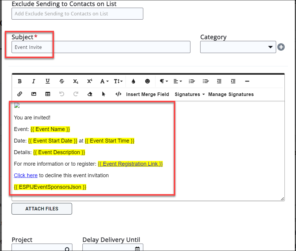 The Send Email screen will automatically populate the subject line with "Event Invite", you may change this to better describe your event. The message will default to the Event Invite template, used when you sent the initial invite.