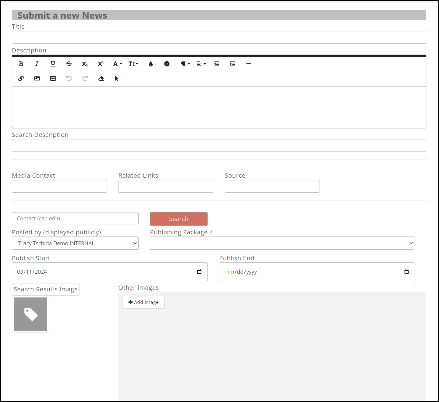 - Click the Search Results icon to add an image to your news item. This image will be displayed in the news items list. Additional images may be added to the news item after it has been saved.