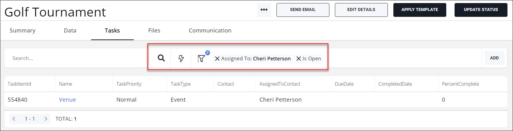 The list of tasks displayed is now filtered to the specific staff member. At a glance, the list displays the name of the task, the priority of the task, the due date, percent complete, etc.