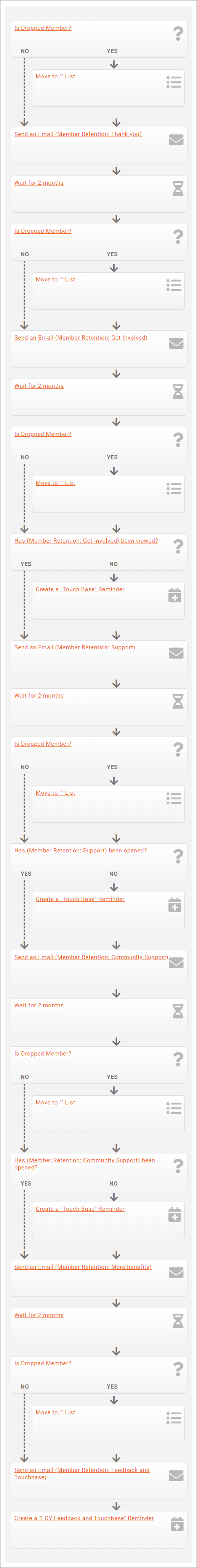 - If they are dropped, the member gets moved to a different list with a different (Win-Back) workflow. (Move to List)