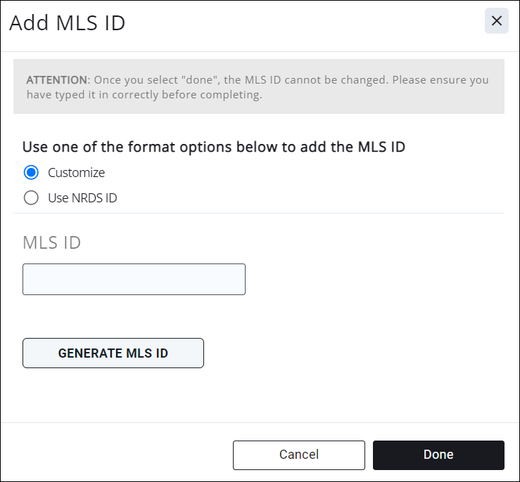 - On the Add MLS ID screen, Dependent on your system configuration, you will be able to use the office M1 ID as the MLS ID, enter a custom MLS ID or generate an MLS ID. IMPORTANT: Once you click Done you will not be able to edit the ID. If this is an existing office that has an MLS ID in MRED enter that MLS ID.