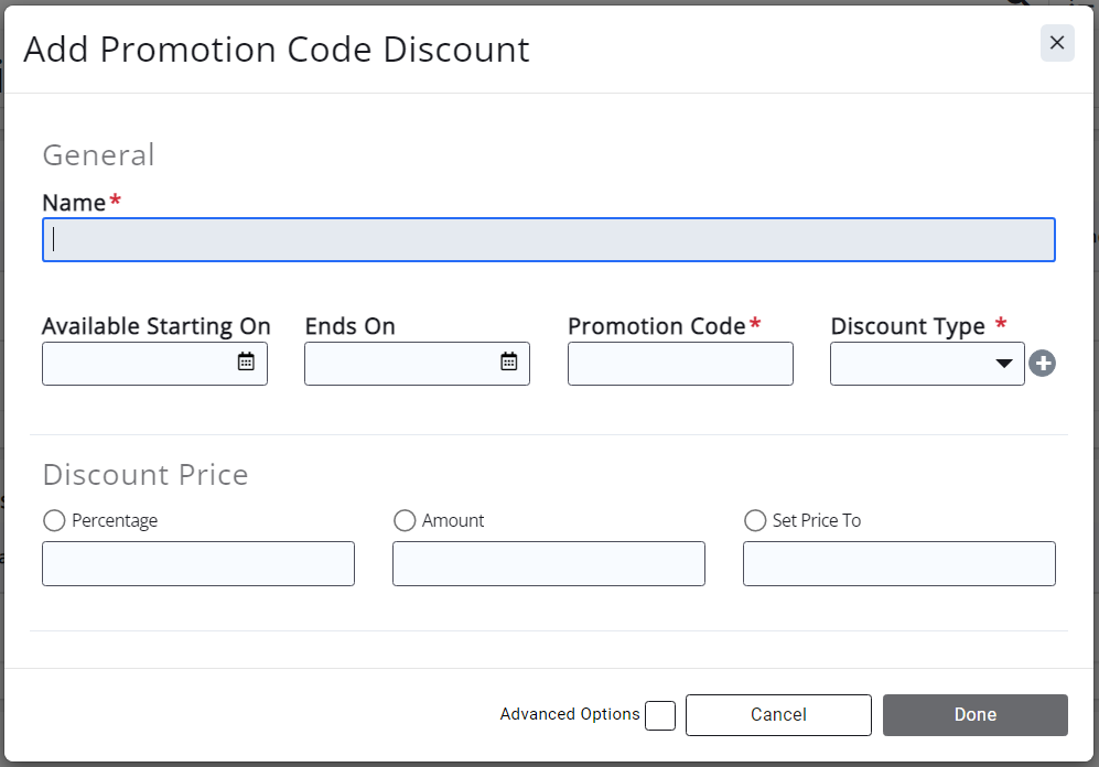 - *Promotion Code: Only appears for Promotion Code discounts. Enter the desired code for the discount. NOTE: Promo Codes are CASE SENSITIVE and must be entered onto the registration form the EXACT way they appear here. (Required for Promotion Code discounts.)