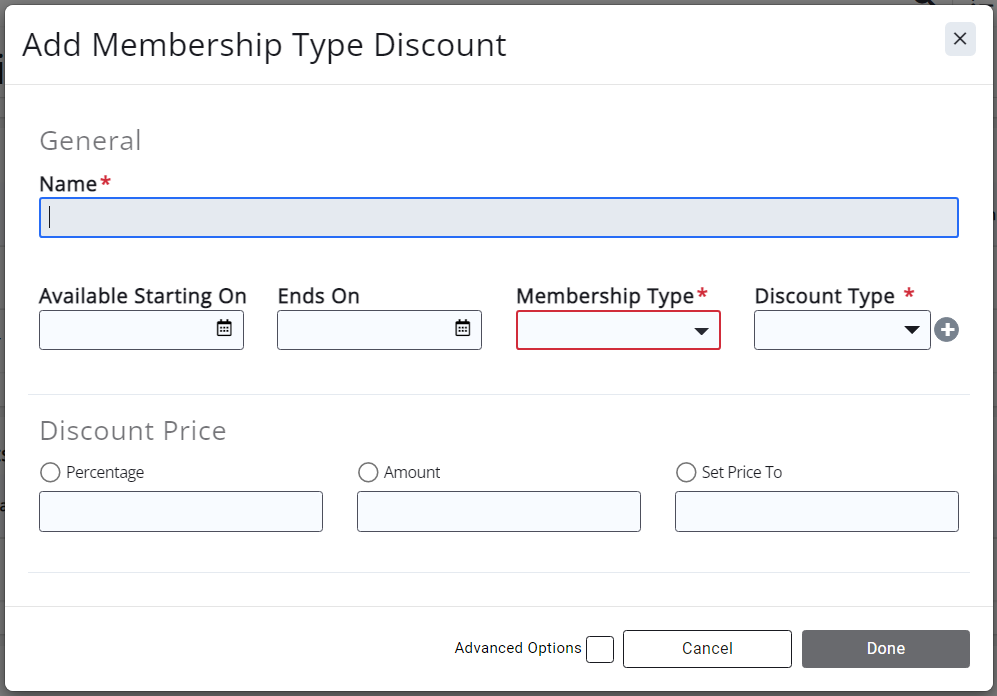 - *Membership Type: Only appears for Membership Type discounts. Select the applicable Membership Type. (Required for Membership Type discounts.)