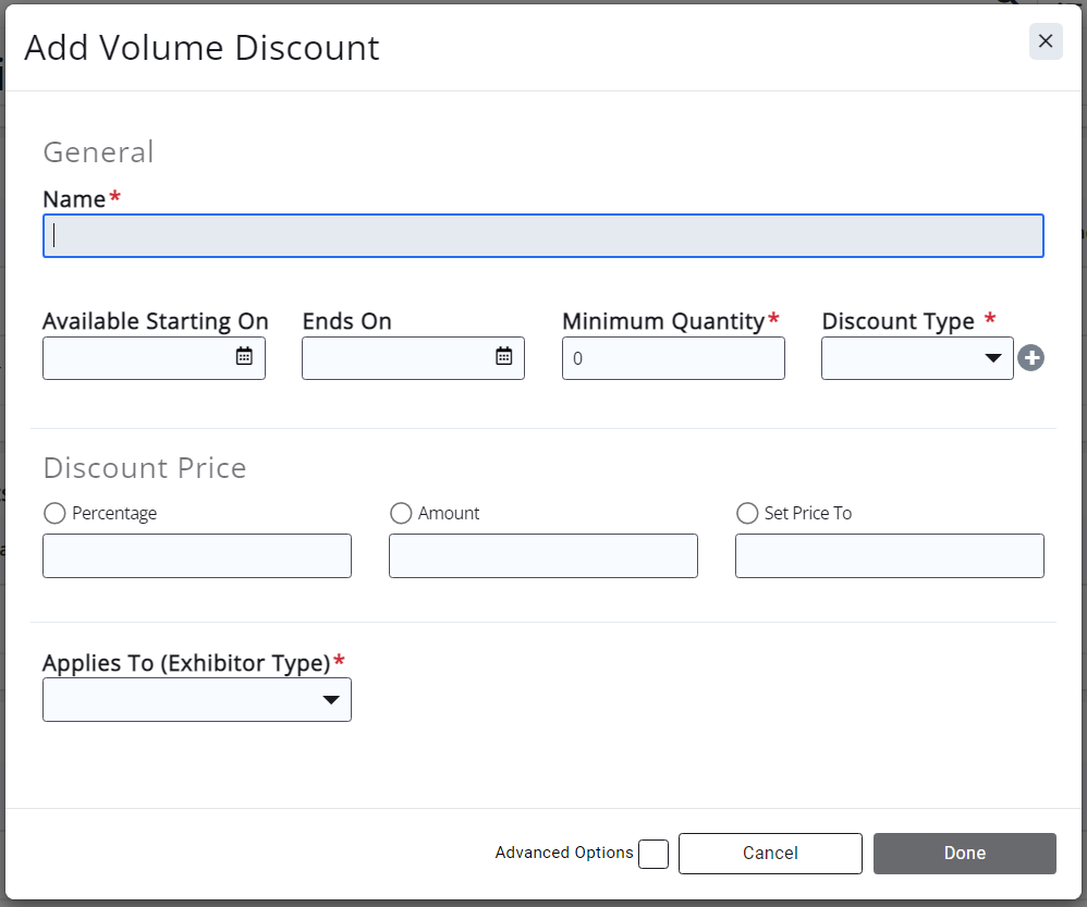 - *Minimum Quantity: Only appears for Volume discounts. Enter the minimum number of registrations purchased to trigger the discount. (Required for Volume discounts.)