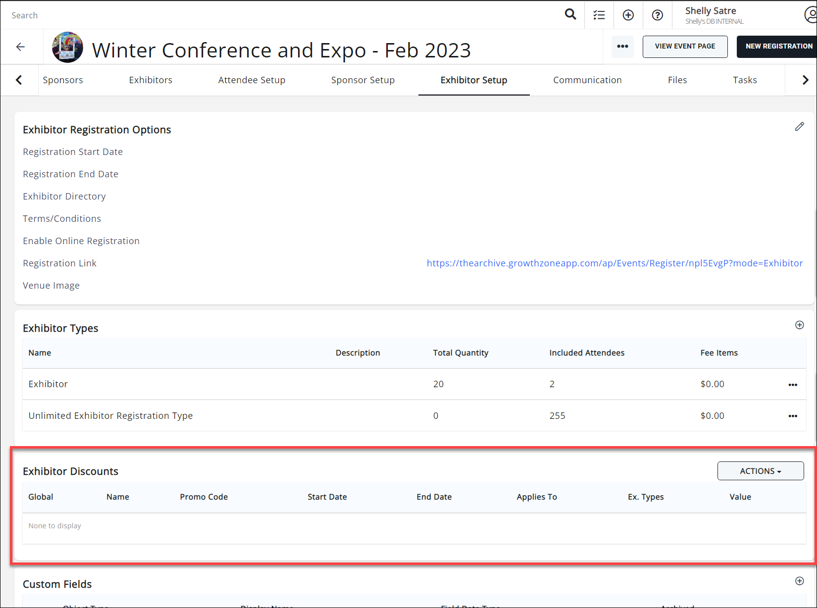 Discounts for Exhibitors are set up on the Event's Exhibitor Setup tab and can be based on early registration, promo code, membership type, or volume.