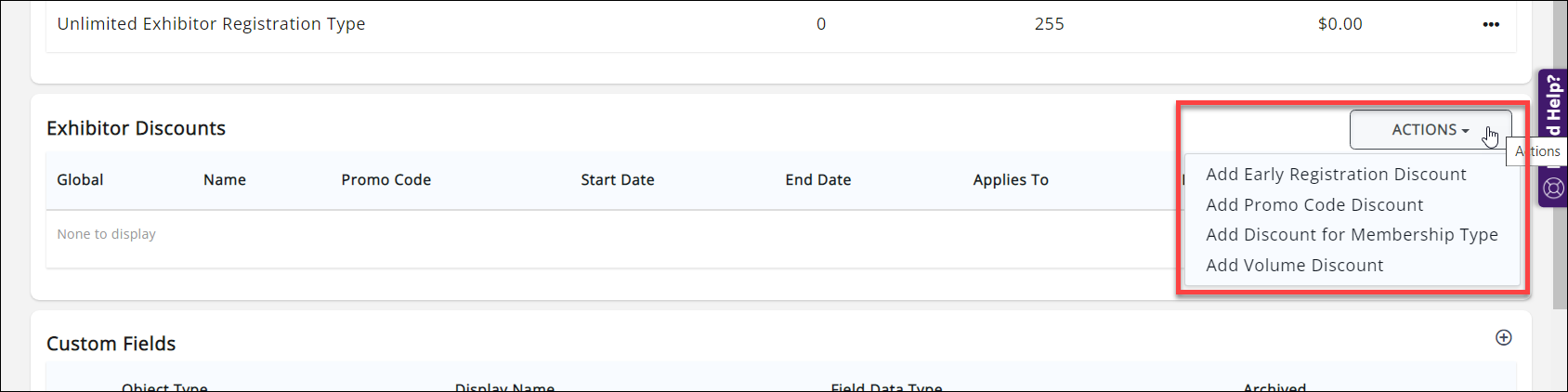 In the Exhibitor Discounts section, click the drop-down arrow on the Actions button to select the type of discount you wish to set up.