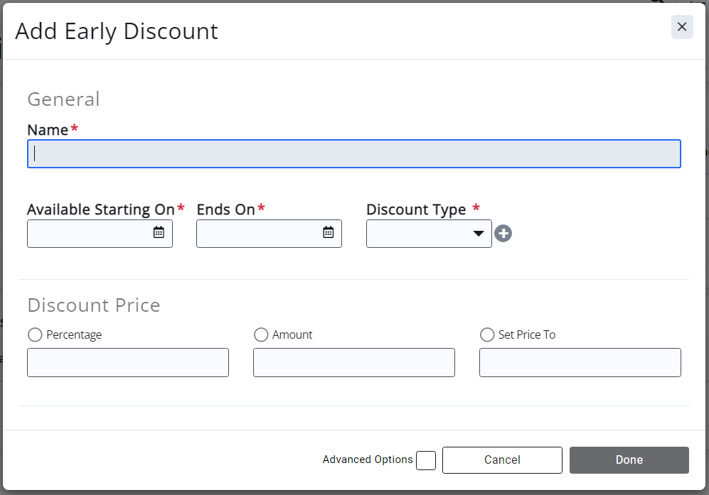 - Available Starting On - Enter the date this discount takes effect. (Required for Early Registration discounts.)