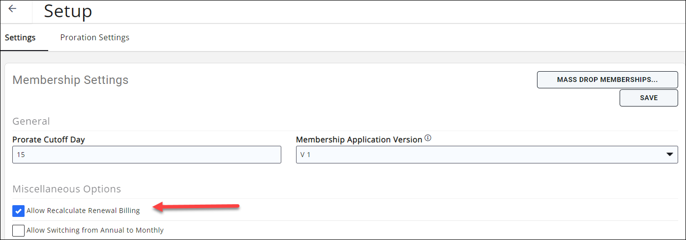 To add a voluntary fee item to scheduled membership billings that are already in place, you’ll need to use the recalculation tool. To do this, make sure your membership settings allow for recalculation and your membership types are set to “Recalculate Price”.