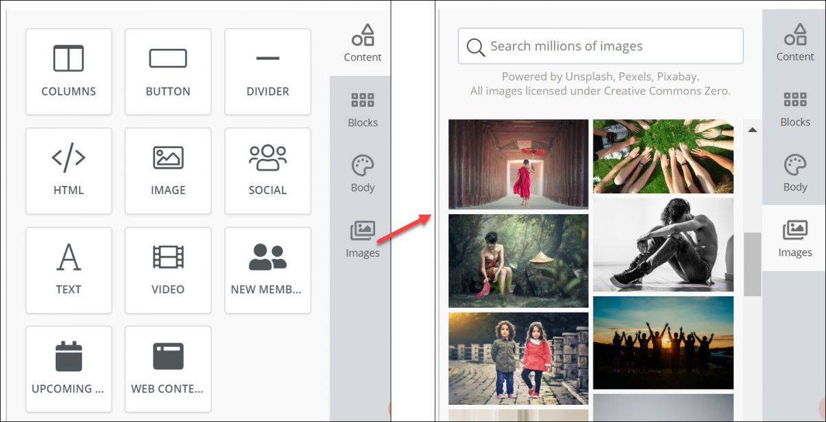 A variety of stock images are also available for you to use. Click the Images icon, to choose an image, and drag & drop it into your newsletter.