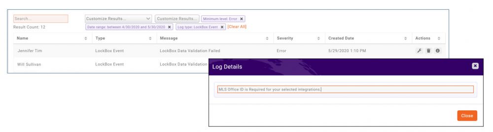 - Error: Use this option to view errors that may result in SentriLock rejecting the record. For Example: If data is missing, SentriLock will reject the record. When filtered to Error the following actions may be performed: