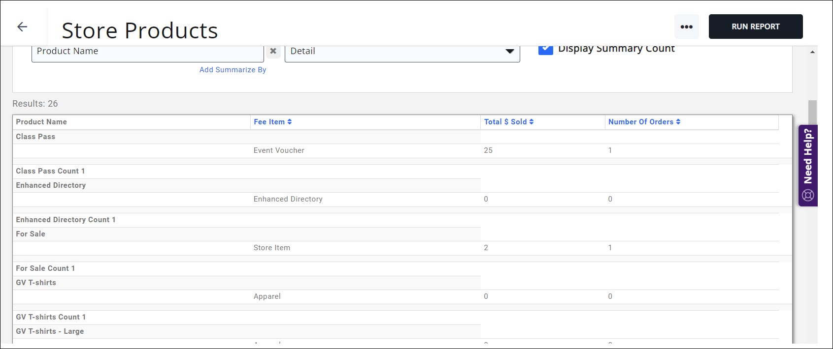 The Store Products report will generate a list of all of your store products, along with the number sold of each item, and the number of orders for each item. The report may be filtered by date range so you can see what you have sold over a period of time, by specific categories, or saleable item.