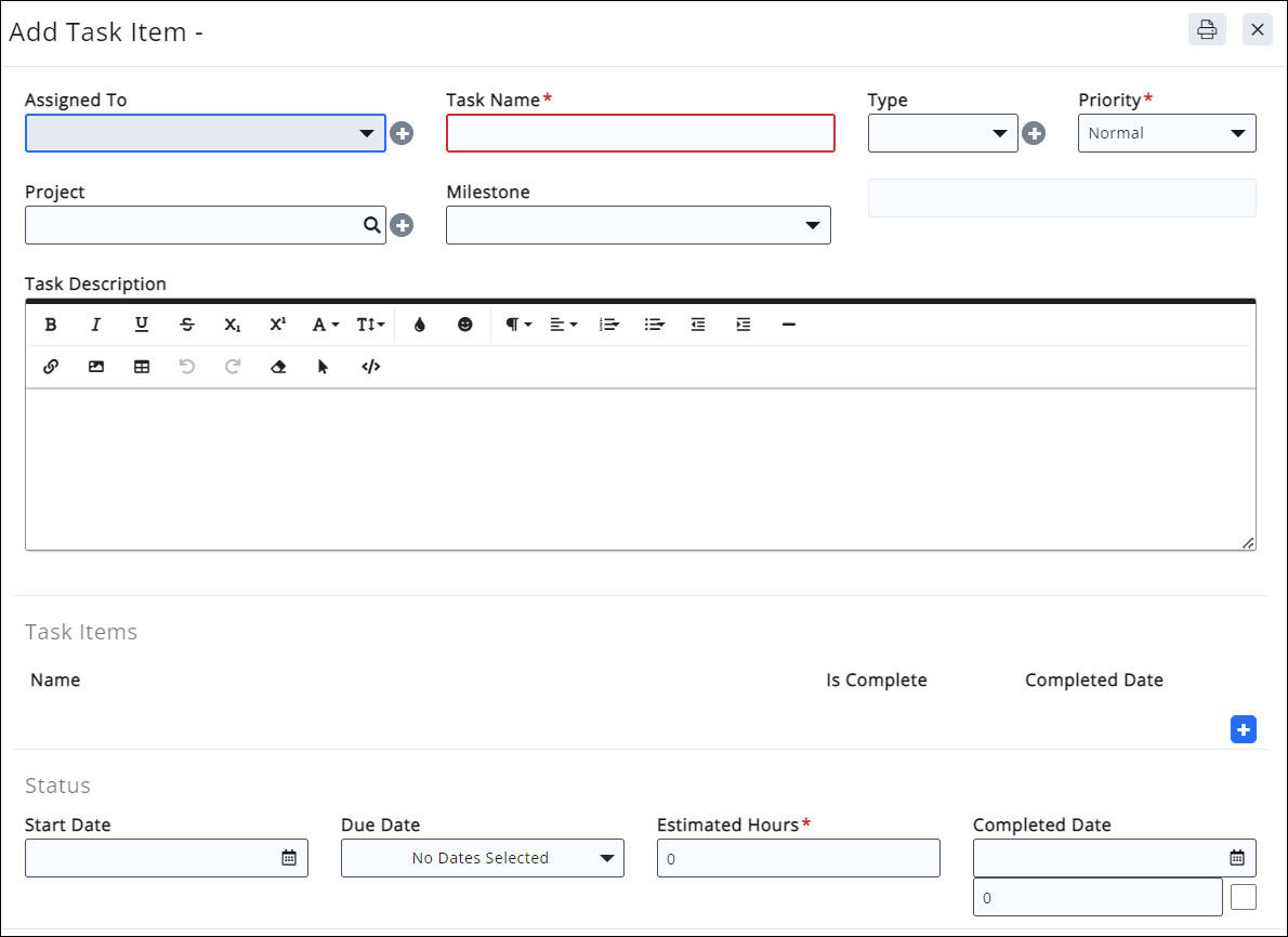 - Estimate Hours: Enter the number of hours that you estimate this task will take to complete.
