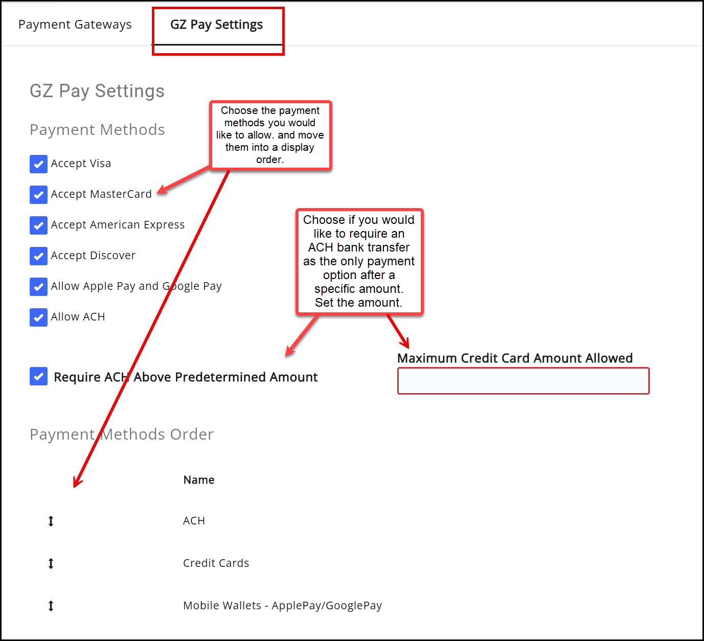Adjust your GZ Pay Settings by selecting which payment settings you would like to offer. Drag them into an order that you would prefer on any payment screen. You can also require customers to pay by ACH when they have reached a certain dollar amount that you choose. See Related Articles for more information on other GrowthZone Pay topics.