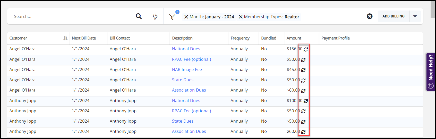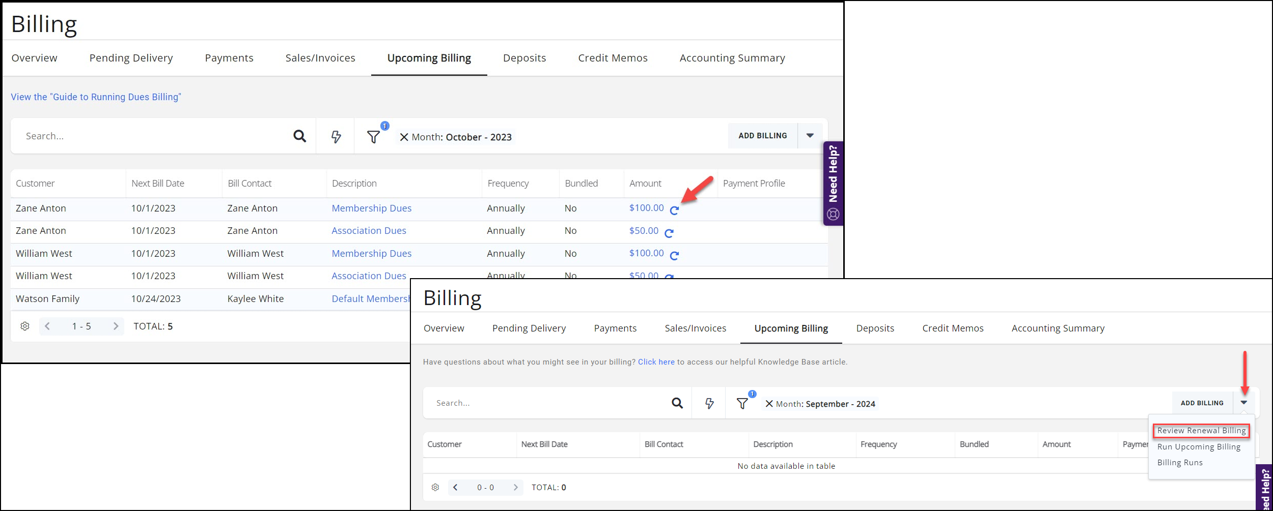 - Recalculated Billing is done while the billing is being run. It is shown by the blue circle arrow. If you want to review pricing prior to generating invoices, use the 'Review Renewal Billing' option in the drop-down.