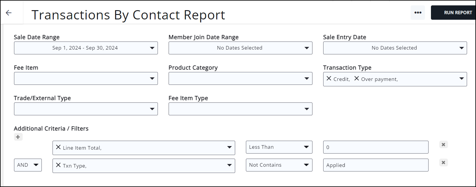 If you are seeking to balance ledger accounts, this is a process completed in your accounting software. GrowthZone holds the details of the transactions, but your accounting software is the system of record. Accounting related questions and how to balance ledger accounts should be directed to the accounting management software you are using. The following tools may be helpful: the Accounting Summary tab of the Billing module filtered to a specific date will provide summary totals as well as the ability to see the individual transaction details within a particular account; the Export Accounting Transactions file will also provide summary information for journal entries into your accounting software; unapplied credits or overpayments may be found using the Transactions By Contact report with the filters shown below.