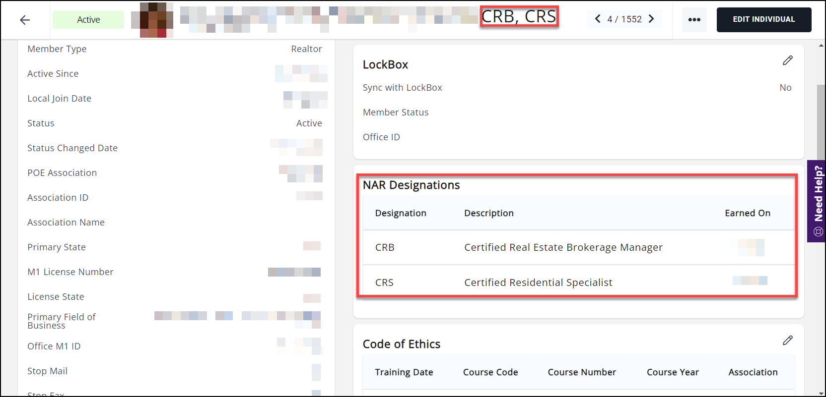 REALTOR® Designations are granted by NAR and originate from the M1 database. If a REALTOR® has any designations, they will appear in the agent record appended to their name in top of the contact record, and on the Real Estate tab between the LockBox and Code of Ethics sections on the right side.