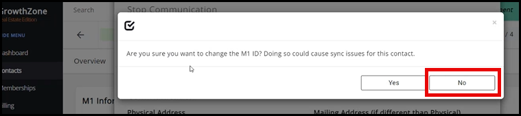 - The M1 ID numbers should not be changed. If the M1 ID numbers are edited or changed accidentally rather than removed, you will receive a pop-up notification that gives you a warning. Best practice is to click 'No' and close out of the tab without saving. If 'Yes' is clicked, the GrowthZone system will ignore the change and will not sync the new number. Our system will ignore changes made to the M1 ID numbers and will not sync an edited number because you cannot change an M1 ID number. You can edit the M1 ID number back to its original number and the sync will be able to be completed.