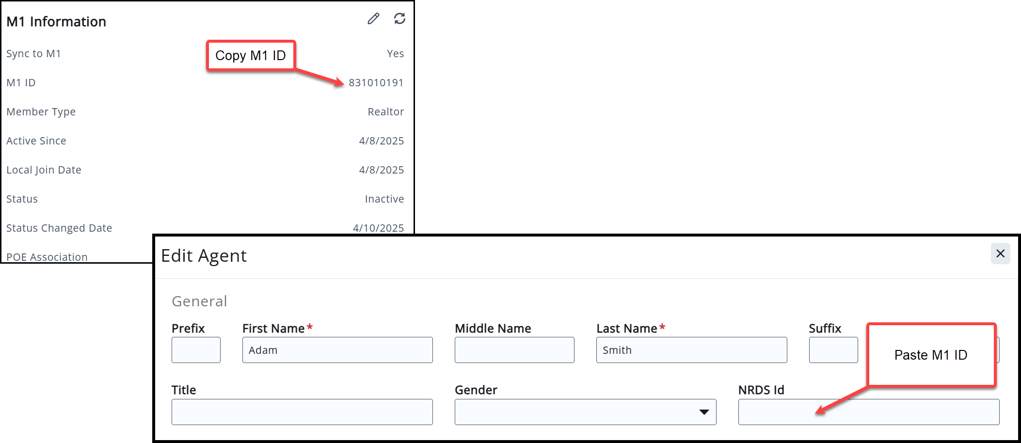As a final step in your merge edit that M1 ID displayed under the agent's name. NOTE: Secondary Agents are not able to have this field updated. Their M1 number will ONLY display on their RE tab.