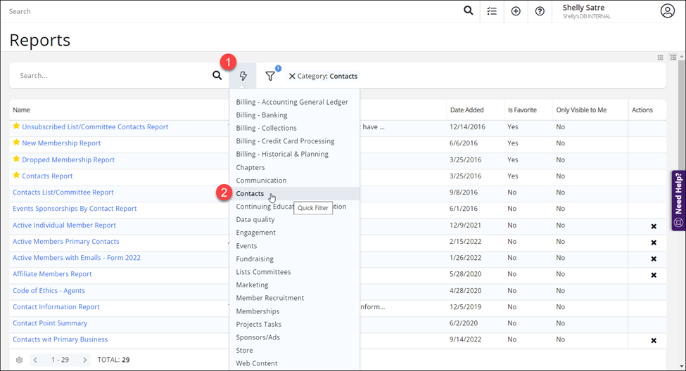 Using the Quick Filter to select the Contacts category. - Select the Fair Housing Completed Report.