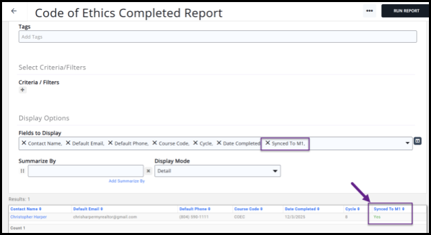 A column is available in the Fair Housing Completed Report called "Synced to M1". The Real Estate Error Log shows errors for any education items in the Education tab. From the Education tab, it can be tough to know which class/training the errors are associated with, so we recommend using the best practice option of using the Fair Housing Completed Report with the Synced to M1 column. This report provides a class-by-class view of whether the sync to M1 has been successful.
