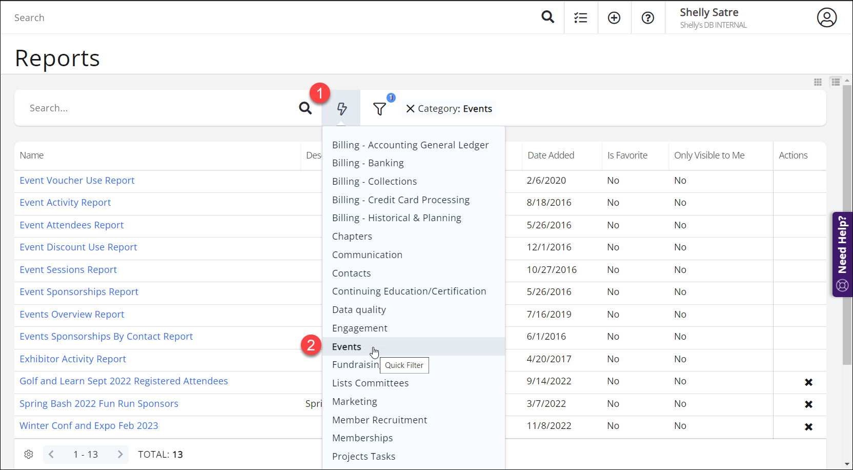 - Use the Quick Filter option to show only Events reports.