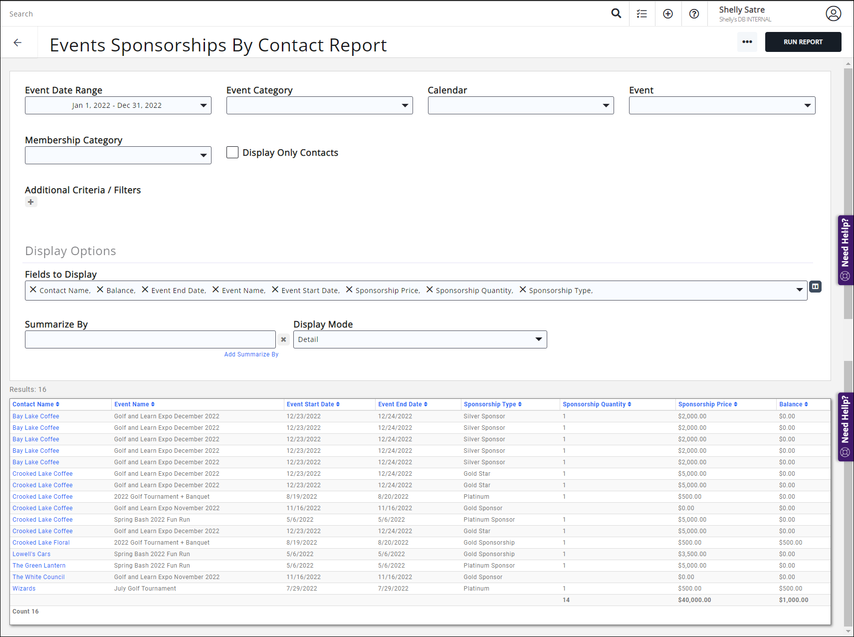 The Event Sponsorships By Contact Report provides the ability to view sponsors with various filters. The report allows you to filter by event date range, event category, calendar, event name, membership category, and to filter by displaying contacts.