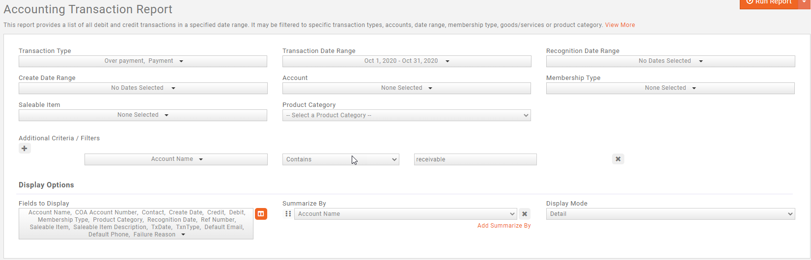 - Additional Criteria/Filters: Account Name > Contains > Receivable