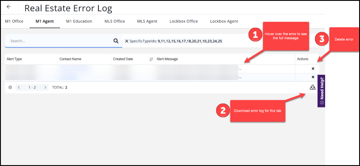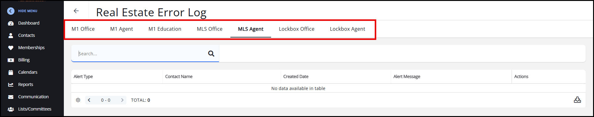 Errors from the various real estate integrations will be displayed on their own tabs, e.g., M1 Agent, M1 Office, MLS Agent, etc.