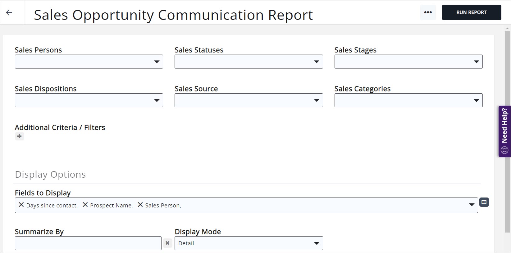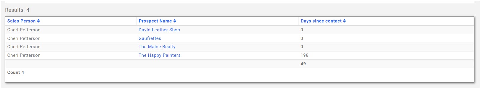 The Sales Opportunity Communication Report will show you a list of sales opportunities, and the number of days since the last communication. This report may be generated by sales person, sales status, sales stage, sales category and sales source. You may add additional filters as needed.