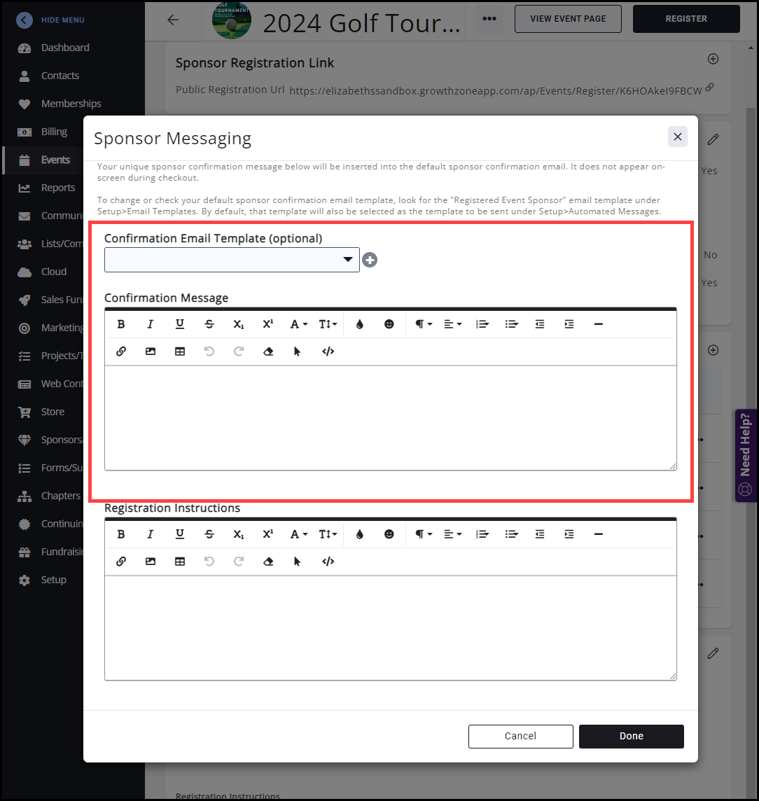 - In the Sponsor Messaging window, select a Confirmation Email Template, or create a new template.