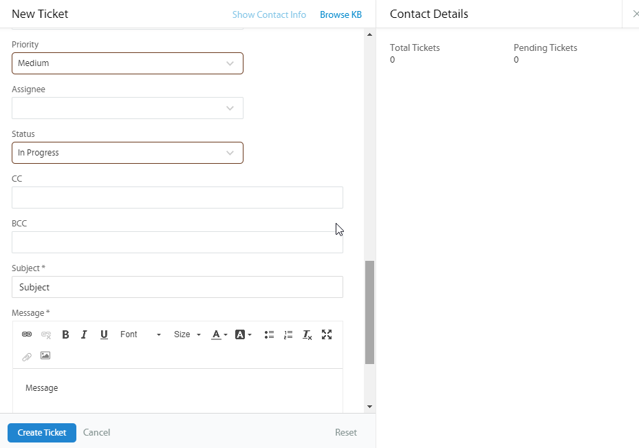 Next select the Priority of the ticket, the Assignee is the Agent that will be working on the ticket and the Status defaults to In Progress.