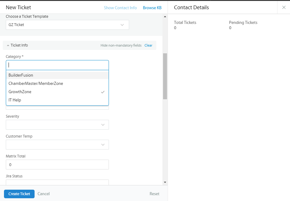 Choose a Ticket Template, BuilderFusion, ChamberMaster/MemberZone, GrowthZone or IT Help. This will populate the Category and the Component list will contain a list matching the software platform.