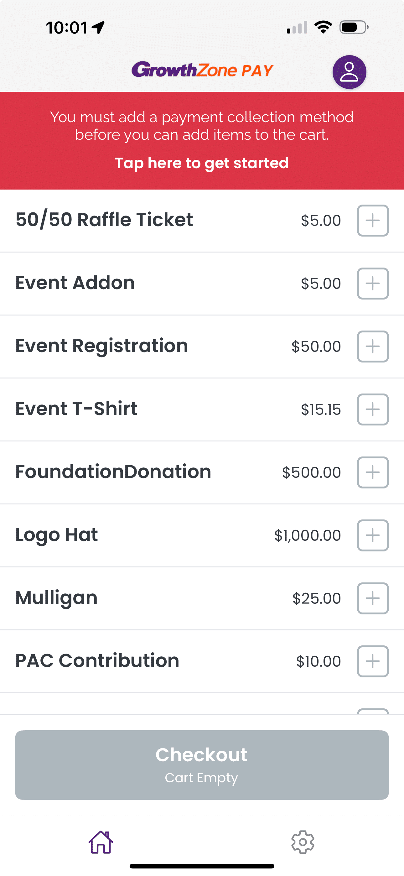 You'll also see a red banner indicating that you can't accept a payment until you connect a card reader or enable Tap to Pay. Either tap the banner or tap the gear icon at the bottom of the app to open the Settings tab.