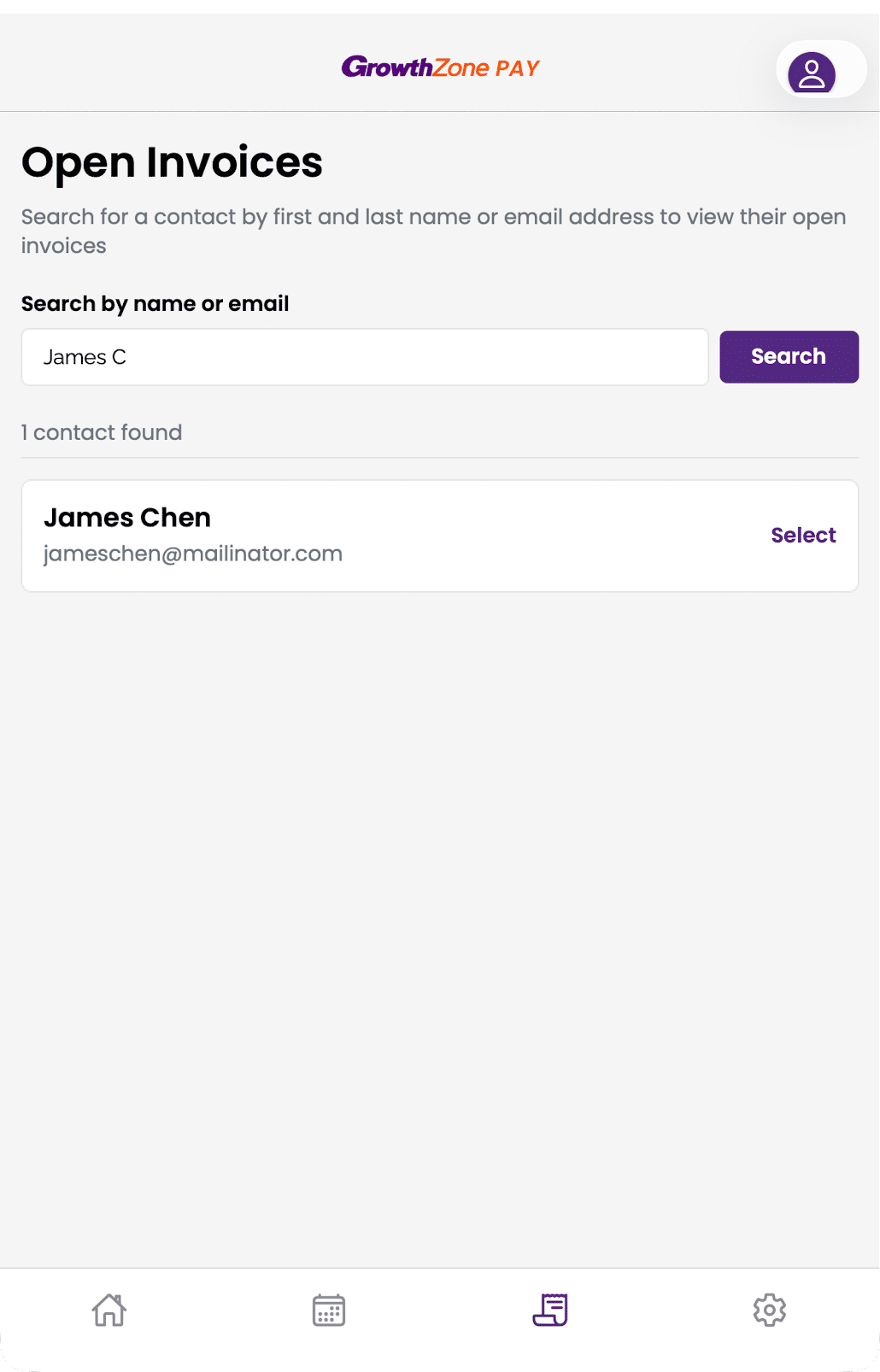 To collect payments for open invoices, tap the invoice icon in the bottom row of navigation icons. From there, enter the name or email address of an individual with an open invoice. Select the individual that you'd like to collect a payment from.