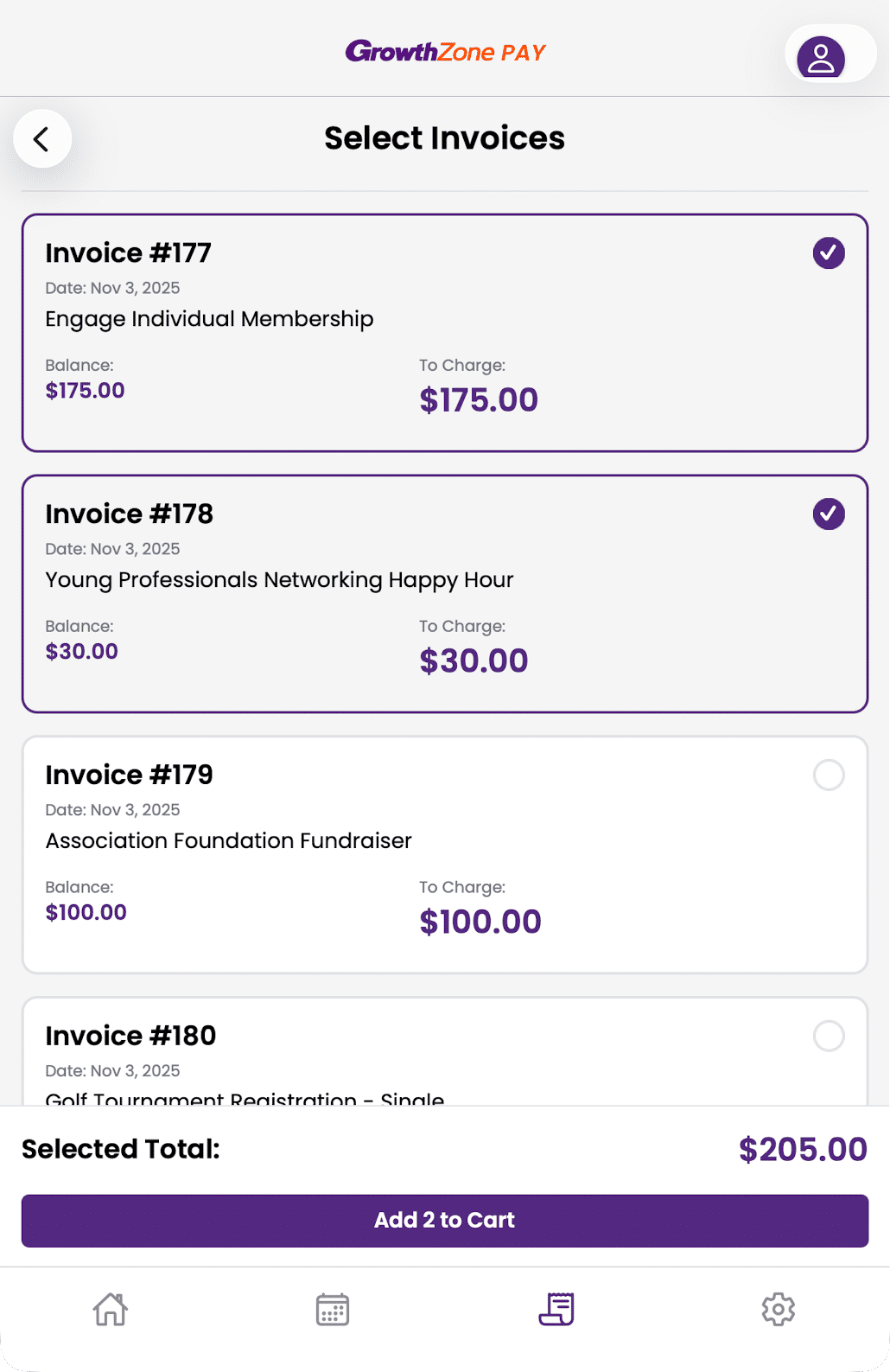 After choosing a contact, the app will show a list of all open invoices. Select one or more invoices to collect a payment for them. Tap Add to Cart to continue collecting a payment.