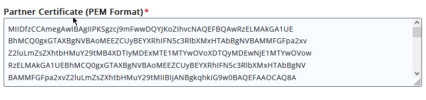 The Partner Certificate (PEM Format)* will match to the large X509Certificate