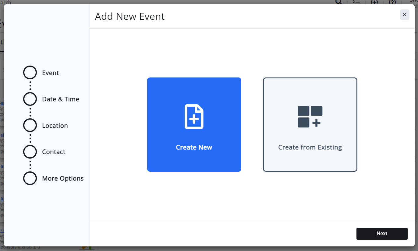 Both options will open the Event wizard. Select the "Create from Existing" option and click Next.